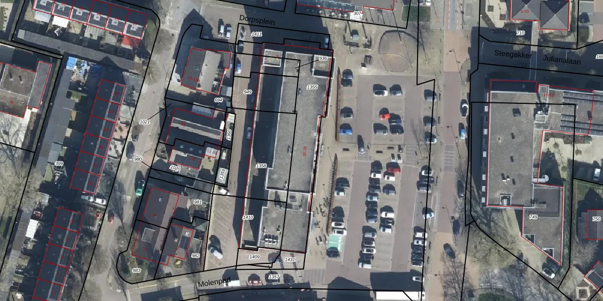 Het perceel waarop Dorpsplein 64 staat heeft een oppervlakte van 725 m². Dit is een groot perceel. De perceeloppervlakte wordt geregistreerd door het Kadaster. Gedetailleerde informatie over de maten van dit perceel kunt u vinden in het rapport Kadastrale kaart met maatvoering van Dorpsplein 64.