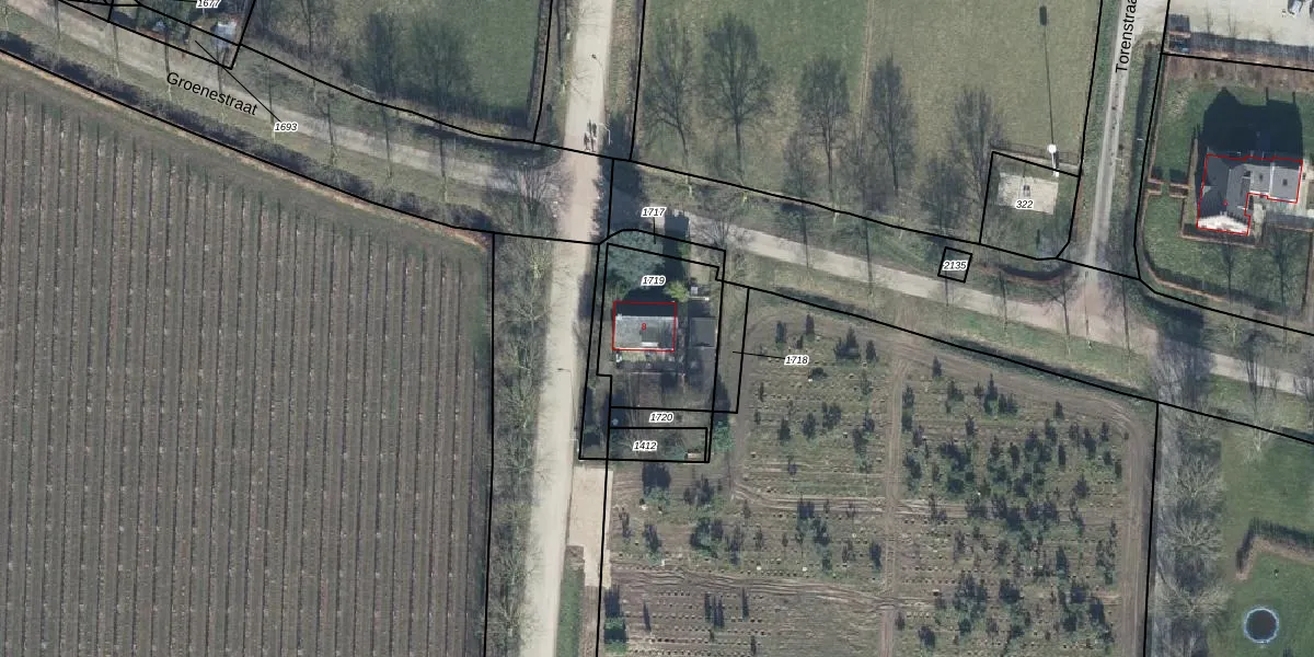 Het perceel waarop Groenestraat 8 staat heeft een oppervlakte van 405 m². Dit is een groot perceel. De perceeloppervlakte wordt geregistreerd door het Kadaster. Gedetailleerde informatie over de maten van dit perceel kunt u vinden in het rapport Kadastrale kaart met maatvoering van Groenestraat 8.
