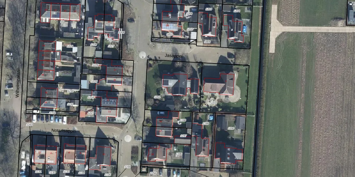 Het perceel waarop Jasappel 2 staat heeft een oppervlakte van 868 m². Dit is een groot perceel. De perceeloppervlakte wordt geregistreerd door het Kadaster. Gedetailleerde informatie over de maten van dit perceel kunt u vinden in het rapport Kadastrale kaart met maatvoering van Jasappel 2.