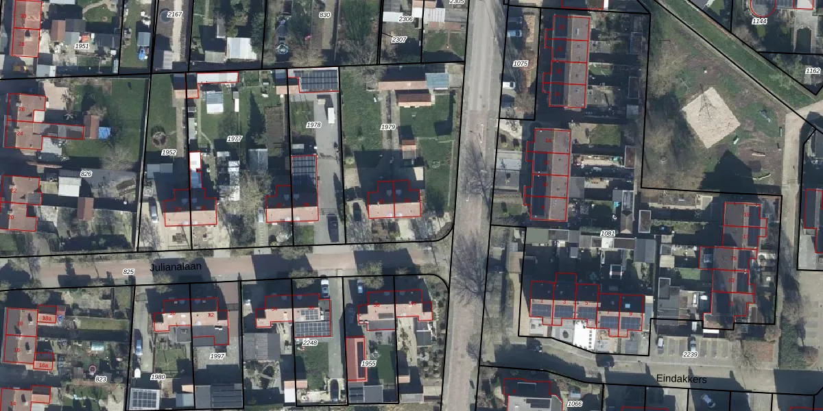 Het perceel waarop Julianalaan 33 staat heeft een oppervlakte van 1225 m². Dit is een zeer groot perceel. De perceeloppervlakte wordt geregistreerd door het Kadaster. Gedetailleerde informatie over de maten van dit perceel kunt u vinden in het rapport Kadastrale kaart met maatvoering van Julianalaan 33.