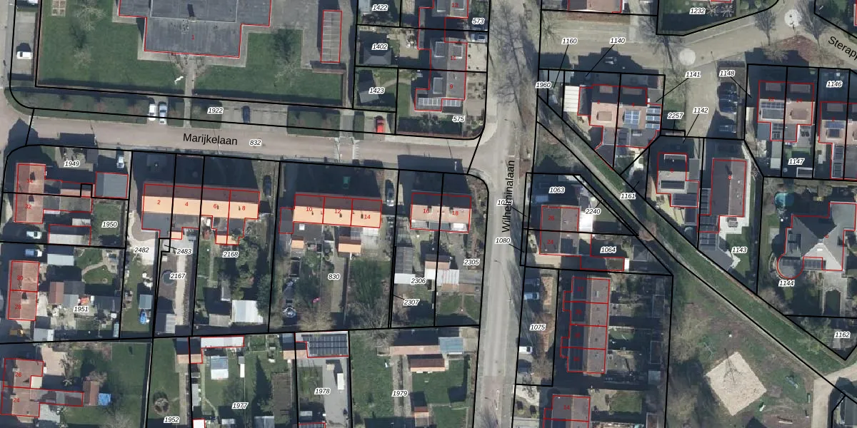 Het perceel waarop Marijkelaan 16 staat heeft een oppervlakte van 369 m². Dit is een groot perceel. De perceeloppervlakte wordt geregistreerd door het Kadaster. Gedetailleerde informatie over de maten van dit perceel kunt u vinden in het rapport Kadastrale kaart met maatvoering van Marijkelaan 16.