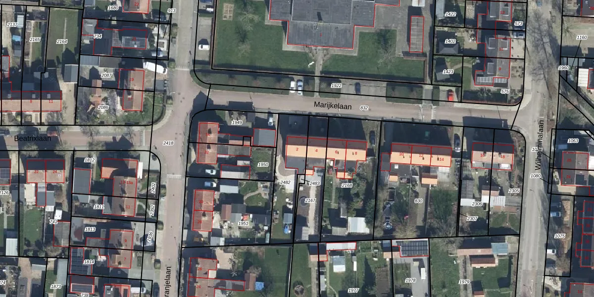 Het perceel waarop Marijkelaan 2 staat heeft een oppervlakte van 388 m². Dit is een groot perceel. De perceeloppervlakte wordt geregistreerd door het Kadaster. Gedetailleerde informatie over de maten van dit perceel kunt u vinden in het rapport Kadastrale kaart met maatvoering van Marijkelaan 2.