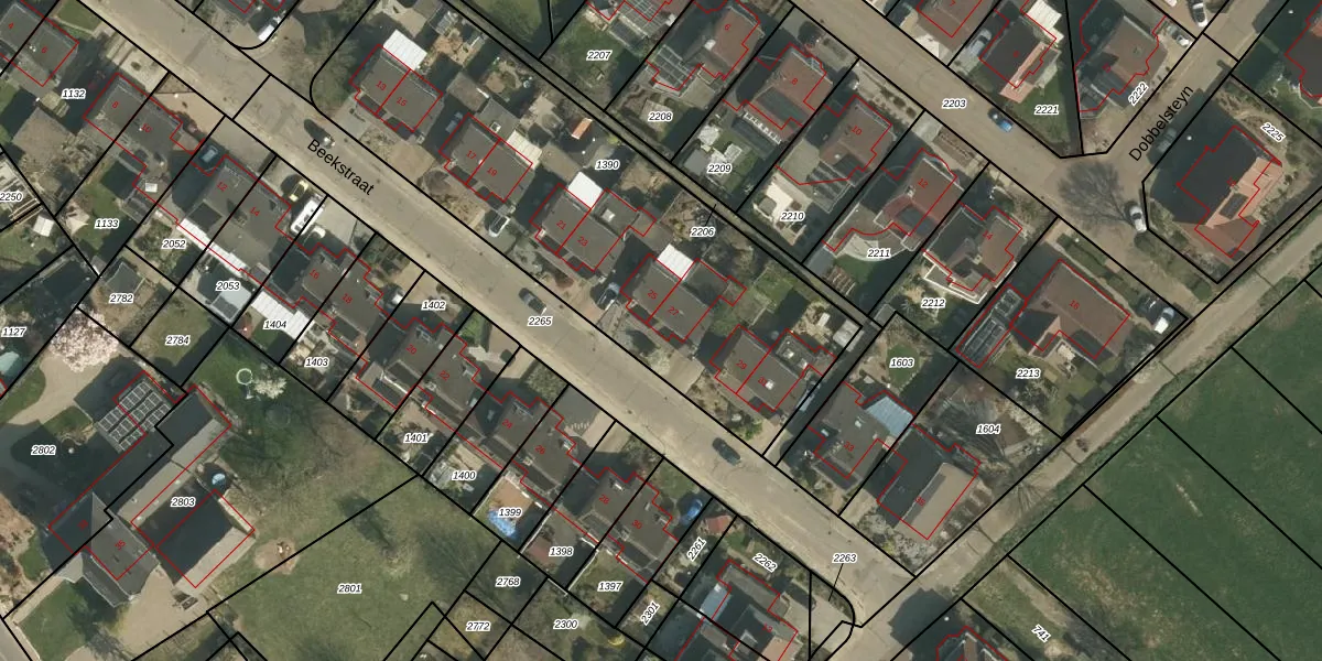 Het perceel waarop Beekstraat 27 staat heeft een oppervlakte van 2205 m². Dit is een zeer groot perceel. De perceeloppervlakte wordt geregistreerd door het Kadaster. Gedetailleerde informatie over de maten van dit perceel kunt u vinden in het rapport Kadastrale kaart met maatvoering van Beekstraat 27.