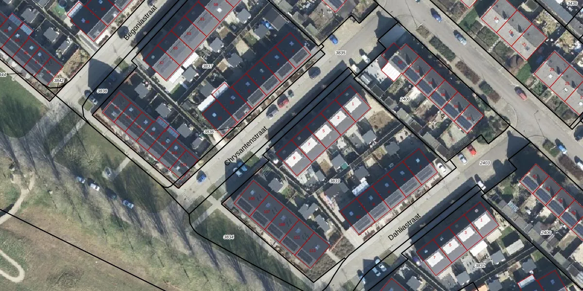 Het perceel waarop Chrysantenstraat 9 staat heeft een oppervlakte van 2831 m². Dit is een zeer groot perceel. De perceeloppervlakte wordt geregistreerd door het Kadaster. Gedetailleerde informatie over de maten van dit perceel kunt u vinden in het rapport Kadastrale kaart met maatvoering van Chrysantenstraat 9.