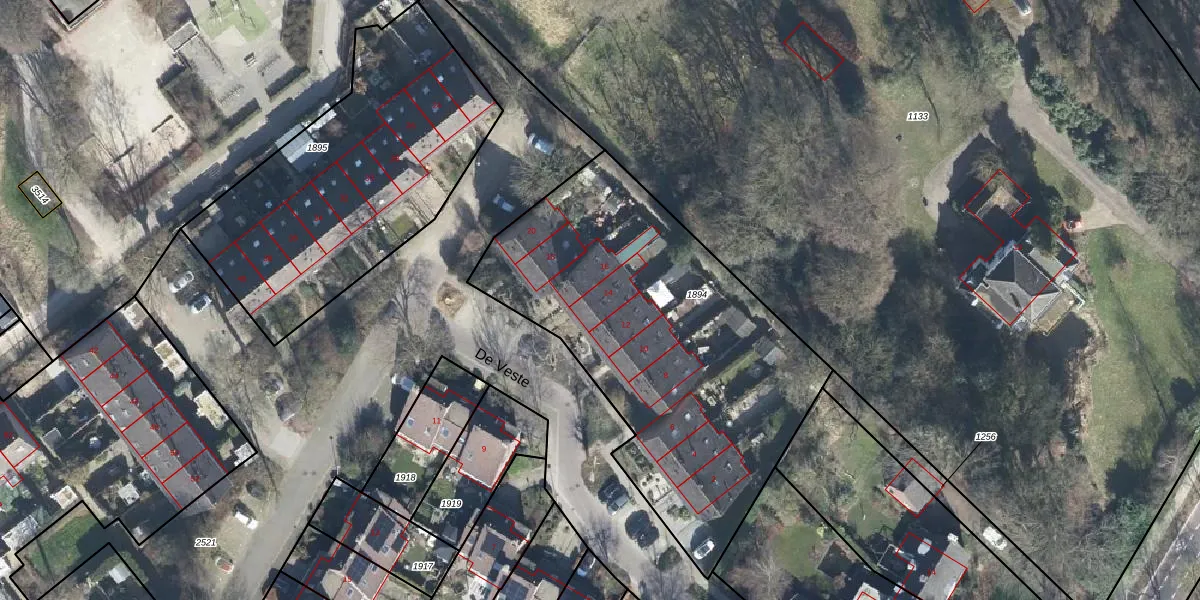 Het perceel waarop De Veste 14 staat heeft een oppervlakte van 1860 m². Dit is een zeer groot perceel. De perceeloppervlakte wordt geregistreerd door het Kadaster. Gedetailleerde informatie over de maten van dit perceel kunt u vinden in het rapport Kadastrale kaart met maatvoering van De Veste 14.