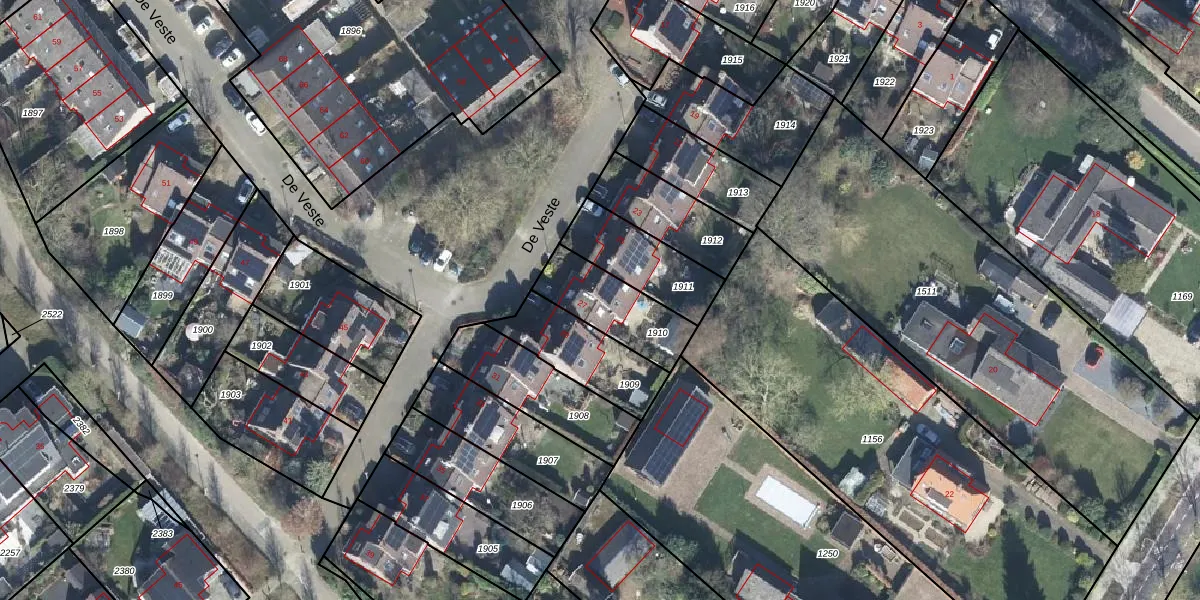 Het perceel waarop De Veste 27 staat heeft een oppervlakte van 241 m². Dit is een middelgroot perceel. De perceeloppervlakte wordt geregistreerd door het Kadaster. Gedetailleerde informatie over de maten van dit perceel kunt u vinden in het rapport Kadastrale kaart met maatvoering van De Veste 27.