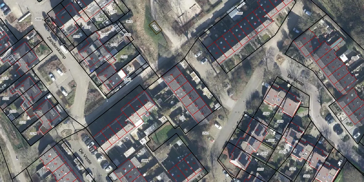 Het perceel waarop De Veste 46 staat heeft een oppervlakte van 3150 m². Dit is een zeer groot perceel. De perceeloppervlakte wordt geregistreerd door het Kadaster. Gedetailleerde informatie over de maten van dit perceel kunt u vinden in het rapport Kadastrale kaart met maatvoering van De Veste 46.