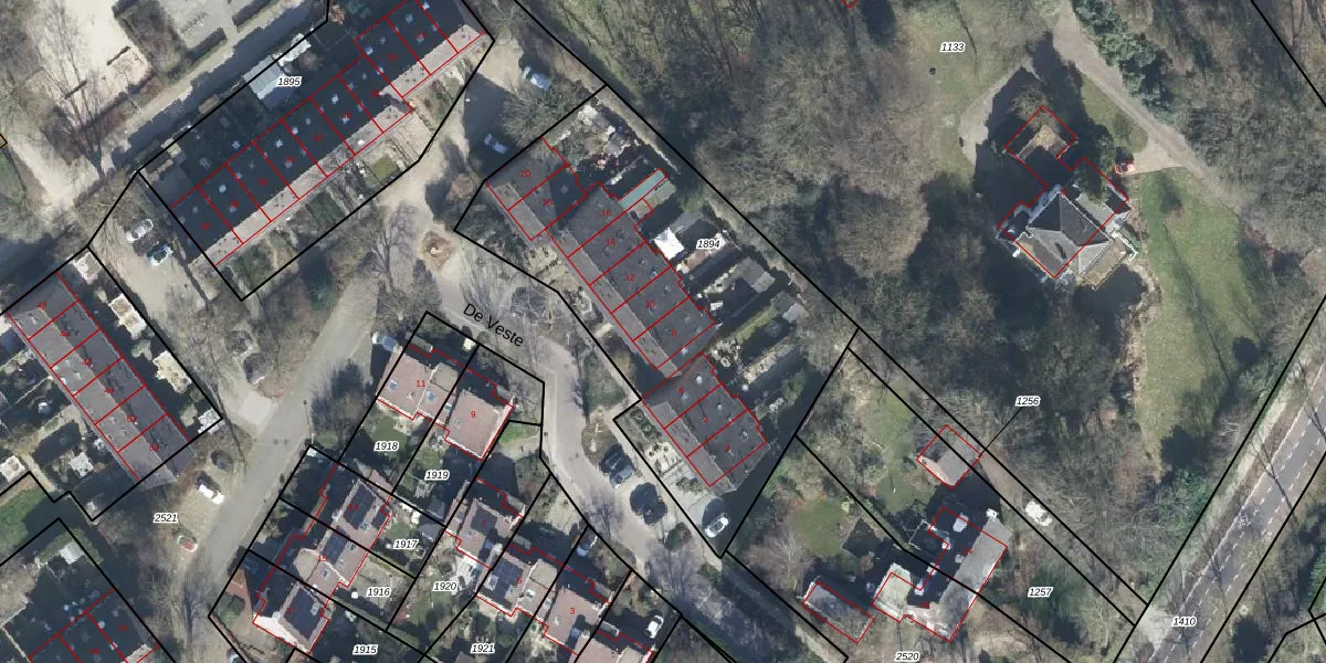 Het perceel waarop De Veste 8 staat heeft een oppervlakte van 1860 m². Dit is een zeer groot perceel. De perceeloppervlakte wordt geregistreerd door het Kadaster. Gedetailleerde informatie over de maten van dit perceel kunt u vinden in het rapport Kadastrale kaart met maatvoering van De Veste 8.