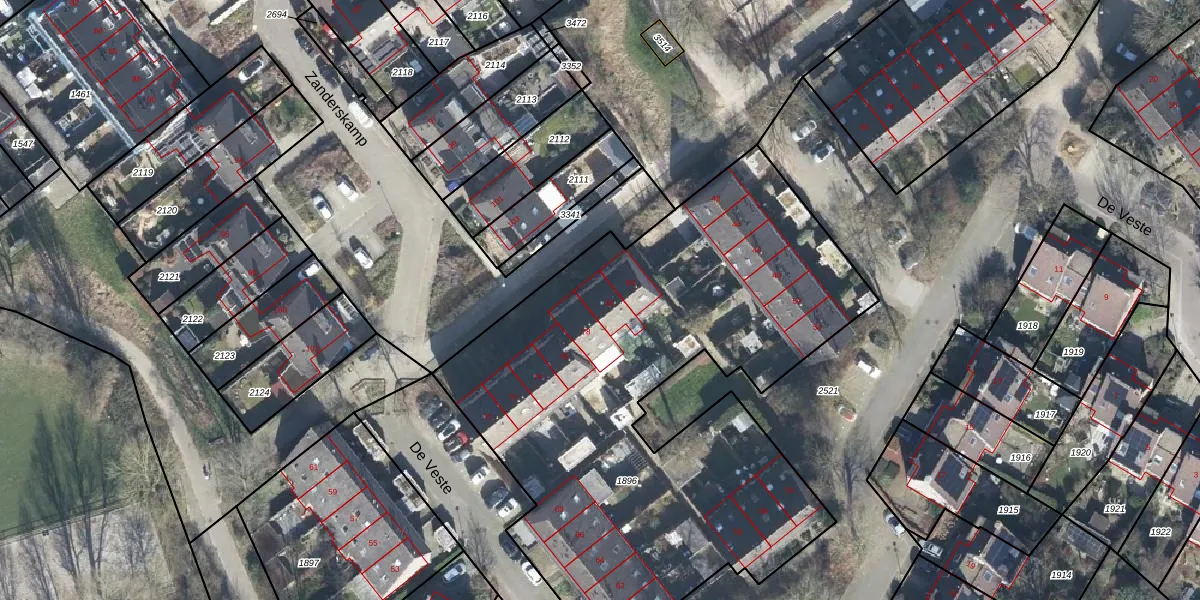 Het perceel waarop De Veste 80 staat heeft een oppervlakte van 3150 m². Dit is een zeer groot perceel. De perceeloppervlakte wordt geregistreerd door het Kadaster. Gedetailleerde informatie over de maten van dit perceel kunt u vinden in het rapport Kadastrale kaart met maatvoering van De Veste 80.