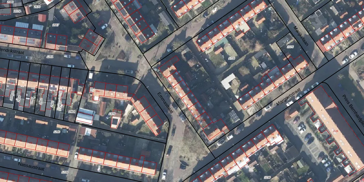 Het perceel waarop Emmastraat 57 staat heeft een oppervlakte van 3668 m². Dit is een zeer groot perceel. De perceeloppervlakte wordt geregistreerd door het Kadaster. Gedetailleerde informatie over de maten van dit perceel kunt u vinden in het rapport Kadastrale kaart met maatvoering van Emmastraat 57.