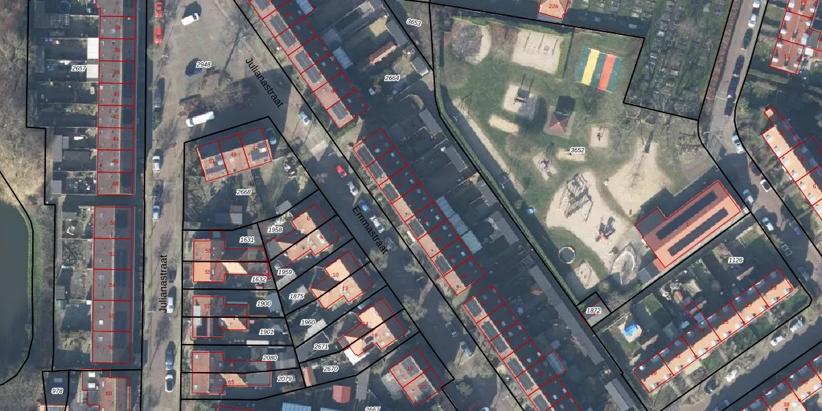 Het perceel waarop Emmastraat 7 staat heeft een oppervlakte van 4485 m². Dit is een zeer groot perceel. De perceeloppervlakte wordt geregistreerd door het Kadaster. Gedetailleerde informatie over de maten van dit perceel kunt u vinden in het rapport Kadastrale kaart met maatvoering van Emmastraat 7.