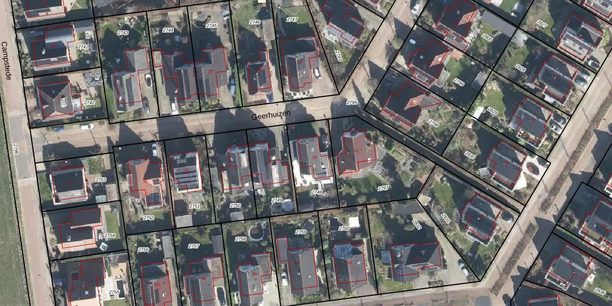 Het perceel waarop Geerhuizen 23 staat heeft een oppervlakte van 400 m². Dit is een groot perceel. De perceeloppervlakte wordt geregistreerd door het Kadaster. Gedetailleerde informatie over de maten van dit perceel kunt u vinden in het rapport Kadastrale kaart met maatvoering van Geerhuizen 23.