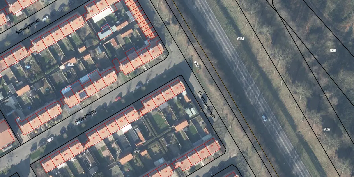 Het perceel waarop Huygenlaan 46 staat heeft een oppervlakte van 4982 m². Dit is een zeer groot perceel. De perceeloppervlakte wordt geregistreerd door het Kadaster. Gedetailleerde informatie over de maten van dit perceel kunt u vinden in het rapport Kadastrale kaart met maatvoering van Huygenlaan 46.
