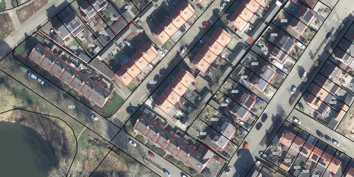 Het perceel waarop Iepenstraat 19 staat heeft een oppervlakte van 3560 m². Dit is een zeer groot perceel. De perceeloppervlakte wordt geregistreerd door het Kadaster. Gedetailleerde informatie over de maten van dit perceel kunt u vinden in het rapport Kadastrale kaart met maatvoering van Iepenstraat 19.
