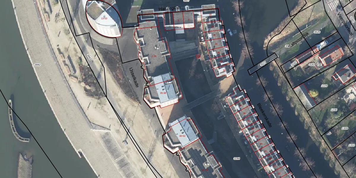 Het perceel waarop IJsselkade 32 staat heeft een oppervlakte van 1,0 ha. Dit is een zeer groot perceel. De perceeloppervlakte wordt geregistreerd door het Kadaster. Gedetailleerde informatie over de maten van dit perceel kunt u vinden in het rapport Kadastrale kaart met maatvoering van IJsselkade 32.