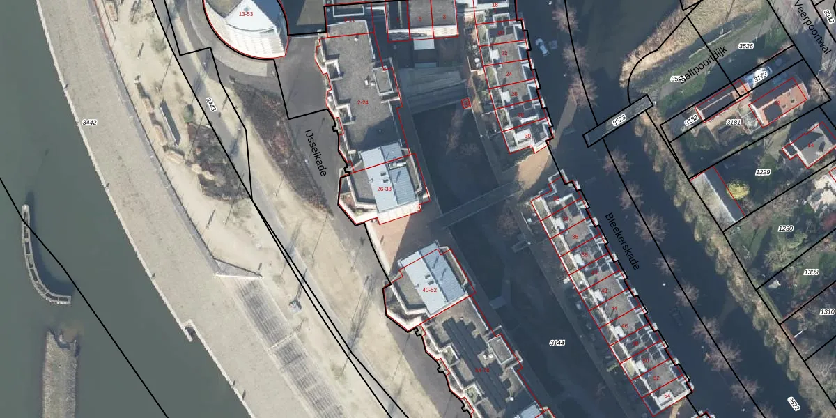 Het perceel waarop IJsselkade 38 staat heeft een oppervlakte van 1,0 ha. Dit is een zeer groot perceel. De perceeloppervlakte wordt geregistreerd door het Kadaster. Gedetailleerde informatie over de maten van dit perceel kunt u vinden in het rapport Kadastrale kaart met maatvoering van IJsselkade 38.