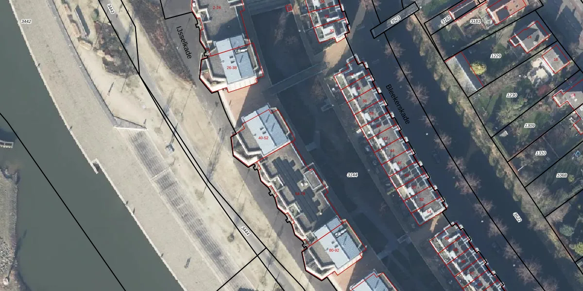 Het perceel waarop IJsselkade 54 staat heeft een oppervlakte van 1,0 ha. Dit is een zeer groot perceel. De perceeloppervlakte wordt geregistreerd door het Kadaster. Gedetailleerde informatie over de maten van dit perceel kunt u vinden in het rapport Kadastrale kaart met maatvoering van IJsselkade 54.