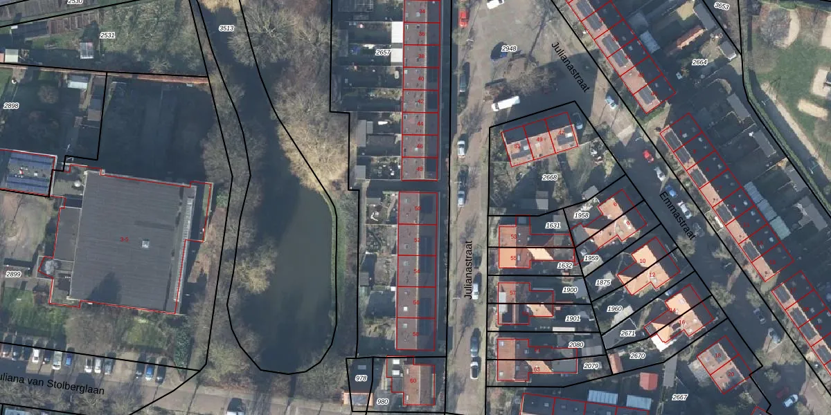 Het perceel waarop Julianastraat 50 staat heeft een oppervlakte van 2270 m². Dit is een zeer groot perceel. De perceeloppervlakte wordt geregistreerd door het Kadaster. Gedetailleerde informatie over de maten van dit perceel kunt u vinden in het rapport Kadastrale kaart met maatvoering van Julianastraat 50.