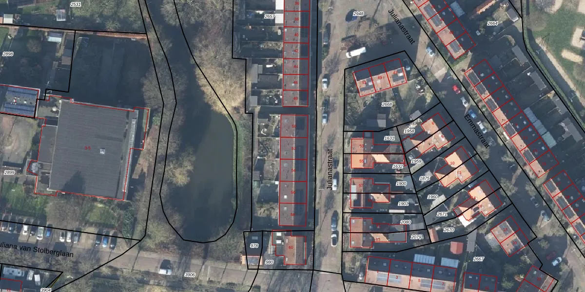 Het perceel waarop Julianastraat 52 staat heeft een oppervlakte van 2270 m². Dit is een zeer groot perceel. De perceeloppervlakte wordt geregistreerd door het Kadaster. Gedetailleerde informatie over de maten van dit perceel kunt u vinden in het rapport Kadastrale kaart met maatvoering van Julianastraat 52.