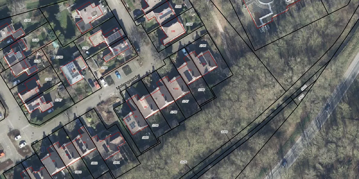 Het perceel waarop Molengaarde 100 staat heeft een oppervlakte van 330 m². Dit is een groot perceel. De perceeloppervlakte wordt geregistreerd door het Kadaster. Gedetailleerde informatie over de maten van dit perceel kunt u vinden in het rapport Kadastrale kaart met maatvoering van Molengaarde 100.