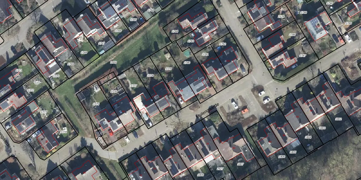 Het perceel waarop Molengaarde 99 staat heeft een oppervlakte van 371 m². Dit is een groot perceel. De perceeloppervlakte wordt geregistreerd door het Kadaster. Gedetailleerde informatie over de maten van dit perceel kunt u vinden in het rapport Kadastrale kaart met maatvoering van Molengaarde 99.