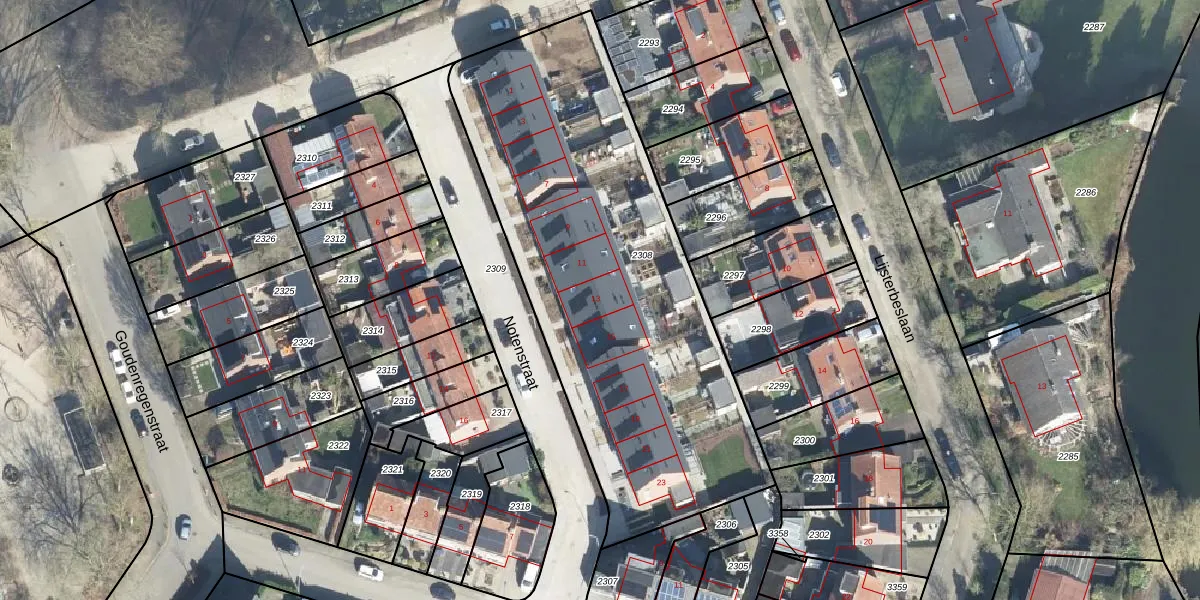 Het perceel waarop Notenstraat 13 staat heeft een oppervlakte van 2255 m². Dit is een zeer groot perceel. De perceeloppervlakte wordt geregistreerd door het Kadaster. Gedetailleerde informatie over de maten van dit perceel kunt u vinden in het rapport Kadastrale kaart met maatvoering van Notenstraat 13.