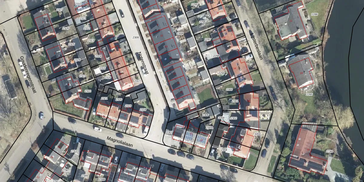 Het perceel waarop Notenstraat 21 staat heeft een oppervlakte van 2255 m². Dit is een zeer groot perceel. De perceeloppervlakte wordt geregistreerd door het Kadaster. Gedetailleerde informatie over de maten van dit perceel kunt u vinden in het rapport Kadastrale kaart met maatvoering van Notenstraat 21.