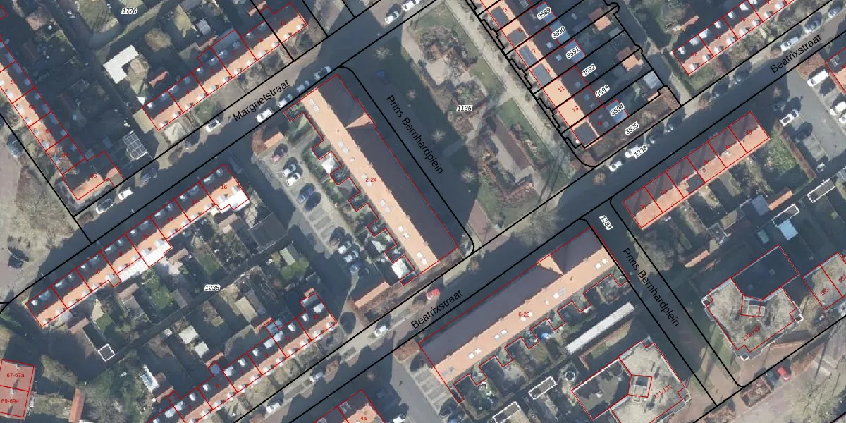 Het perceel waarop Prins Bernhardplein 22 staat heeft een oppervlakte van 7555 m². Dit is een zeer groot perceel. De perceeloppervlakte wordt geregistreerd door het Kadaster. Gedetailleerde informatie over de maten van dit perceel kunt u vinden in het rapport Kadastrale kaart met maatvoering van Prins Bernhardplein 22.