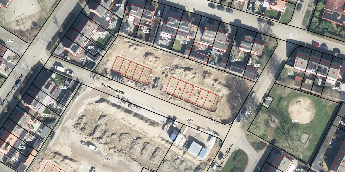 Het perceel waarop Prunusstraat 11 staat heeft een oppervlakte van 2336 m². Dit is een zeer groot perceel. De perceeloppervlakte wordt geregistreerd door het Kadaster. Gedetailleerde informatie over de maten van dit perceel kunt u vinden in het rapport Kadastrale kaart met maatvoering van Prunusstraat 11.