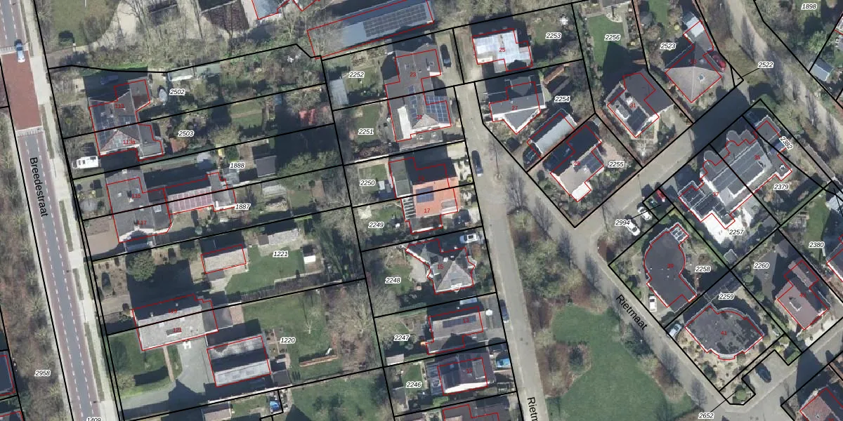 Het perceel waarop Rietmaat 17 staat heeft een oppervlakte van 313 m². Dit is een groot perceel. De perceeloppervlakte wordt geregistreerd door het Kadaster. Gedetailleerde informatie over de maten van dit perceel kunt u vinden in het rapport Kadastrale kaart met maatvoering van Rietmaat 17.