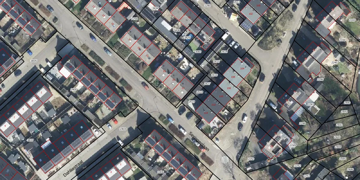 Het perceel waarop Seringenlaan 27 staat heeft een oppervlakte van 2456 m². Dit is een zeer groot perceel. De perceeloppervlakte wordt geregistreerd door het Kadaster. Gedetailleerde informatie over de maten van dit perceel kunt u vinden in het rapport Kadastrale kaart met maatvoering van Seringenlaan 27.