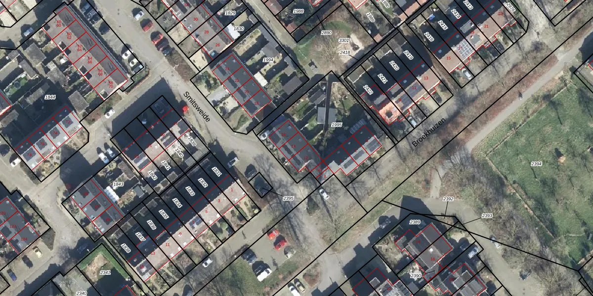 Het perceel waarop Smitsweide 14 staat heeft een oppervlakte van 995 m². Dit is een groot perceel. De perceeloppervlakte wordt geregistreerd door het Kadaster. Gedetailleerde informatie over de maten van dit perceel kunt u vinden in het rapport Kadastrale kaart met maatvoering van Smitsweide 14.