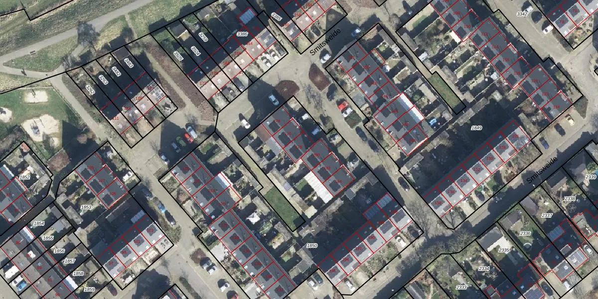 Het perceel waarop Smitsweide 178 staat heeft een oppervlakte van 3300 m². Dit is een zeer groot perceel. De perceeloppervlakte wordt geregistreerd door het Kadaster. Gedetailleerde informatie over de maten van dit perceel kunt u vinden in het rapport Kadastrale kaart met maatvoering van Smitsweide 178.