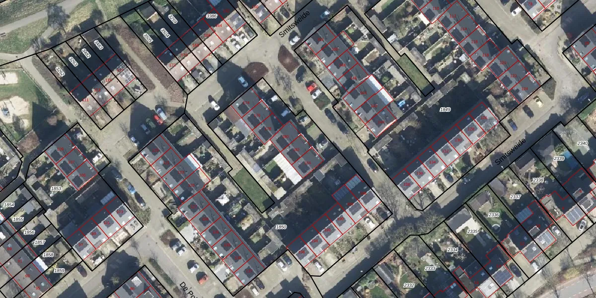 Het perceel waarop Smitsweide 182 staat heeft een oppervlakte van 3300 m². Dit is een zeer groot perceel. De perceeloppervlakte wordt geregistreerd door het Kadaster. Gedetailleerde informatie over de maten van dit perceel kunt u vinden in het rapport Kadastrale kaart met maatvoering van Smitsweide 182.