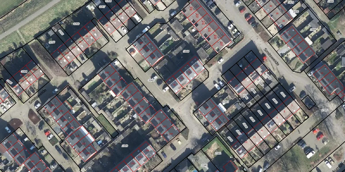 Het perceel waarop Smitsweide 78 staat heeft een oppervlakte van 2025 m². Dit is een zeer groot perceel. De perceeloppervlakte wordt geregistreerd door het Kadaster. Gedetailleerde informatie over de maten van dit perceel kunt u vinden in het rapport Kadastrale kaart met maatvoering van Smitsweide 78.