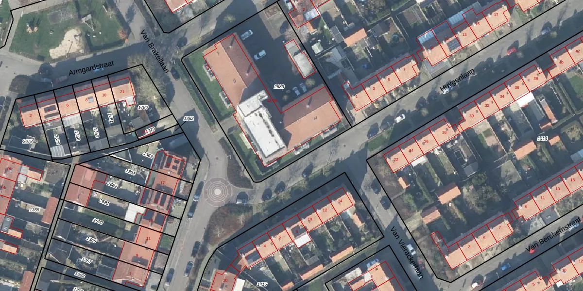 Het perceel waarop Van Brakellaan 22-c staat heeft een oppervlakte van 1940 m². Dit is een zeer groot perceel. De perceeloppervlakte wordt geregistreerd door het Kadaster. Gedetailleerde informatie over de maten van dit perceel kunt u vinden in het rapport Kadastrale kaart met maatvoering van Van Brakellaan 22-c.