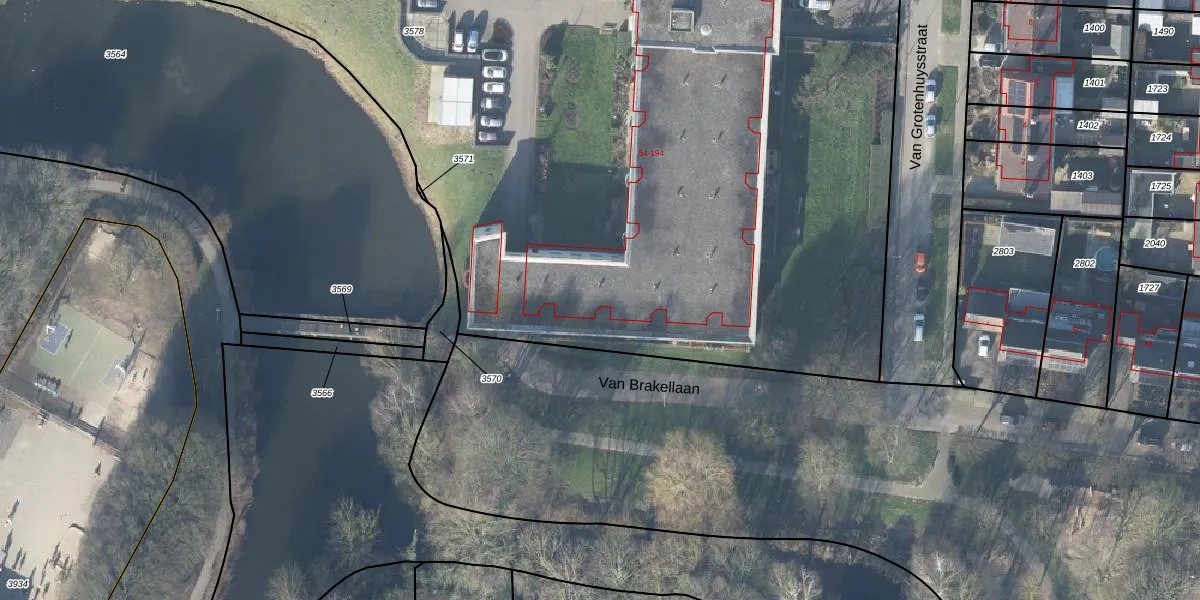 Het perceel waarop Van Brakellaan 80 staat heeft een oppervlakte van 1,5 ha. Dit is een zeer groot perceel. De perceeloppervlakte wordt geregistreerd door het Kadaster. Gedetailleerde informatie over de maten van dit perceel kunt u vinden in het rapport Kadastrale kaart met maatvoering van Van Brakellaan 80.