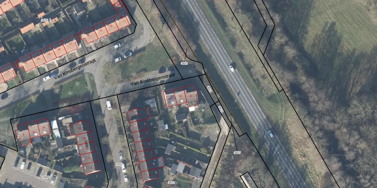 Het perceel waarop Van Kinsbergenstraat 20 staat heeft een oppervlakte van 4897 m². Dit is een zeer groot perceel. De perceeloppervlakte wordt geregistreerd door het Kadaster. Gedetailleerde informatie over de maten van dit perceel kunt u vinden in het rapport Kadastrale kaart met maatvoering van Van Kinsbergenstraat 20.