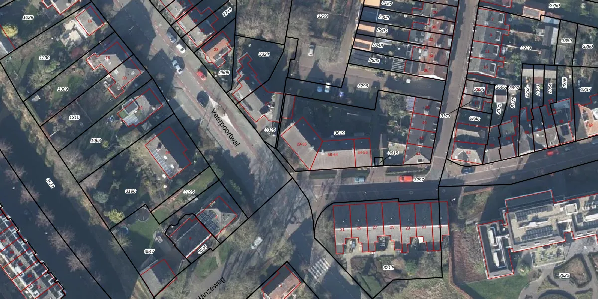 Het perceel waarop Veerpoortwal 33 staat heeft een oppervlakte van 1187 m². Dit is een zeer groot perceel. De perceeloppervlakte wordt geregistreerd door het Kadaster. Gedetailleerde informatie over de maten van dit perceel kunt u vinden in het rapport Kadastrale kaart met maatvoering van Veerpoortwal 33.
