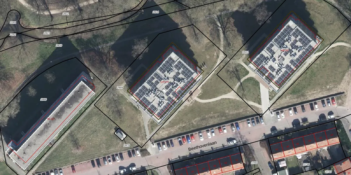 Het perceel waarop Beethovenlaan 175 staat heeft een oppervlakte van 917 m². Dit is een groot perceel. De perceeloppervlakte wordt geregistreerd door het Kadaster. Gedetailleerde informatie over de maten van dit perceel kunt u vinden in het rapport Kadastrale kaart met maatvoering van Beethovenlaan 175.