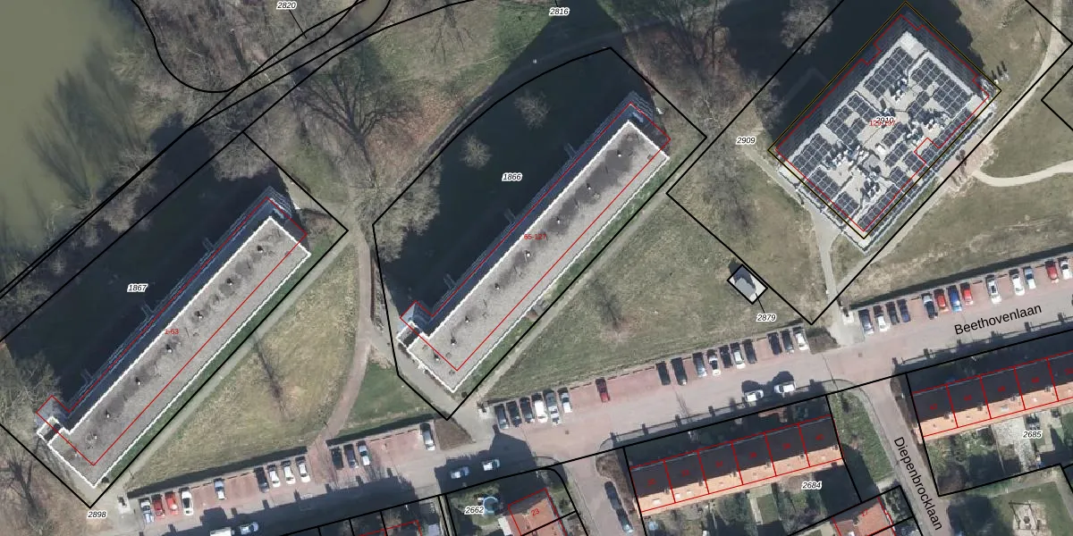 Het perceel waarop Beethovenlaan 87 staat heeft een oppervlakte van 2142 m². Dit is een zeer groot perceel. De perceeloppervlakte wordt geregistreerd door het Kadaster. Gedetailleerde informatie over de maten van dit perceel kunt u vinden in het rapport Kadastrale kaart met maatvoering van Beethovenlaan 87.