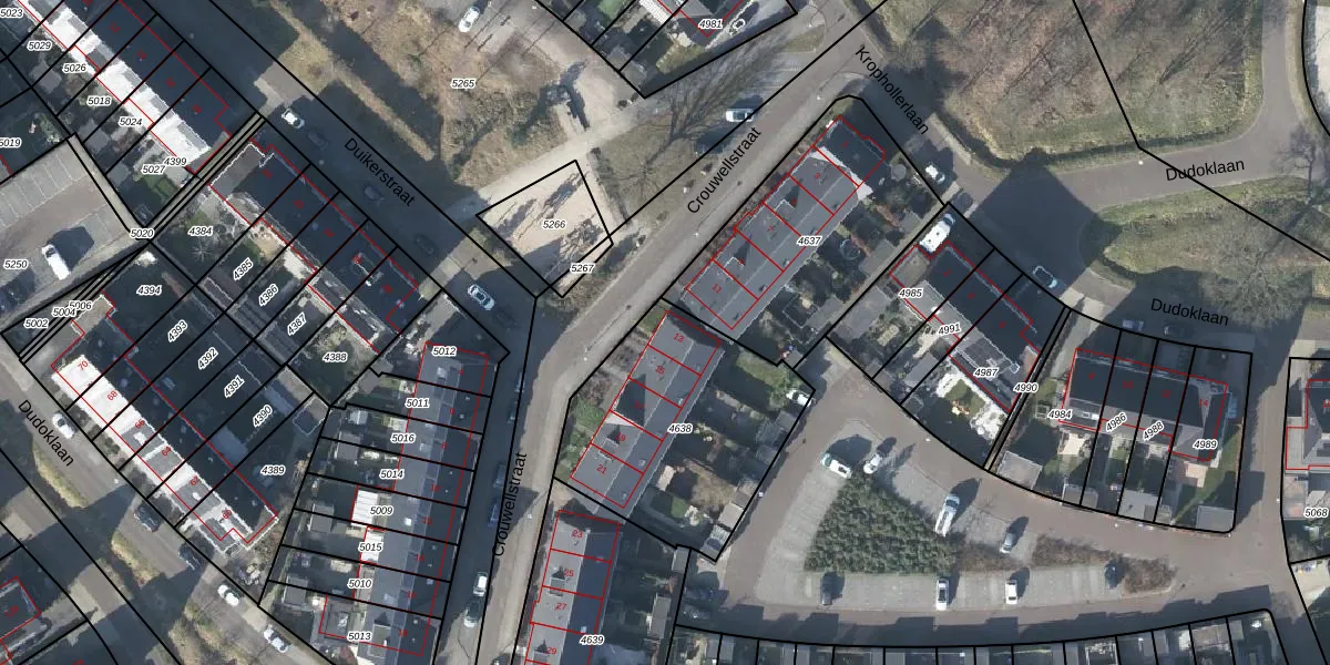 Het perceel waarop Crouwellstraat 13 staat heeft een oppervlakte van 912 m². Dit is een groot perceel. De perceeloppervlakte wordt geregistreerd door het Kadaster. Gedetailleerde informatie over de maten van dit perceel kunt u vinden in het rapport Kadastrale kaart met maatvoering van Crouwellstraat 13.