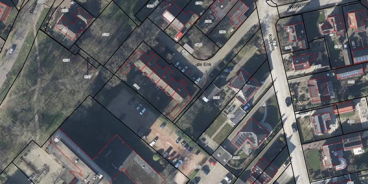 Het perceel waarop de Enk 1 staat heeft een oppervlakte van 975 m². Dit is een groot perceel. De perceeloppervlakte wordt geregistreerd door het Kadaster. Gedetailleerde informatie over de maten van dit perceel kunt u vinden in het rapport Kadastrale kaart met maatvoering van de Enk 1.
