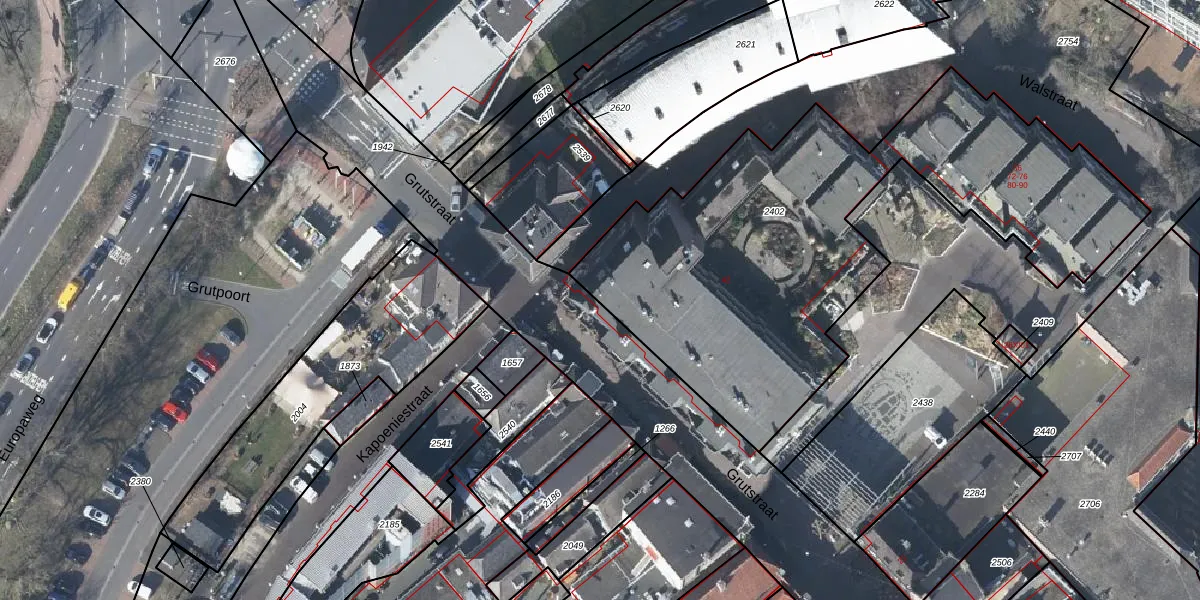 Het perceel waarop Grutstraat 42 staat heeft een oppervlakte van 2420 m². Dit is een zeer groot perceel. De perceeloppervlakte wordt geregistreerd door het Kadaster. Gedetailleerde informatie over de maten van dit perceel kunt u vinden in het rapport Kadastrale kaart met maatvoering van Grutstraat 42.