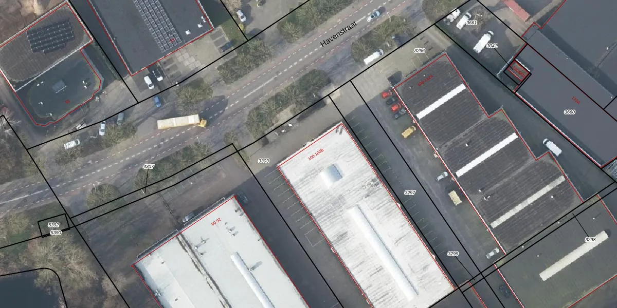 Het perceel waarop Havenstraat 100 staat heeft een oppervlakte van 2636 m². Dit is een zeer groot perceel. De perceeloppervlakte wordt geregistreerd door het Kadaster. Gedetailleerde informatie over de maten van dit perceel kunt u vinden in het rapport Kadastrale kaart met maatvoering van Havenstraat 100.