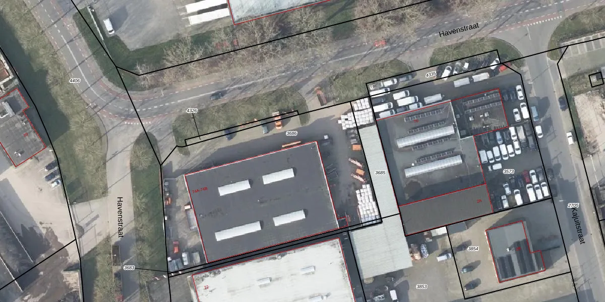 Het perceel waarop Havenstraat 74-B staat heeft een oppervlakte van 2738 m². Dit is een zeer groot perceel. De perceeloppervlakte wordt geregistreerd door het Kadaster. Gedetailleerde informatie over de maten van dit perceel kunt u vinden in het rapport Kadastrale kaart met maatvoering van Havenstraat 74-B.