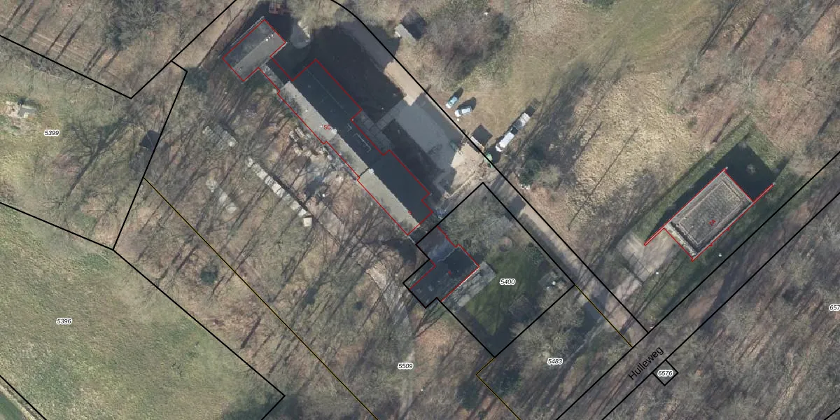 Het perceel waarop Hulleweg 5-E staat heeft een oppervlakte van 6950 m². Dit is een zeer groot perceel. De perceeloppervlakte wordt geregistreerd door het Kadaster. Gedetailleerde informatie over de maten van dit perceel kunt u vinden in het rapport Kadastrale kaart met maatvoering van Hulleweg 5-E.