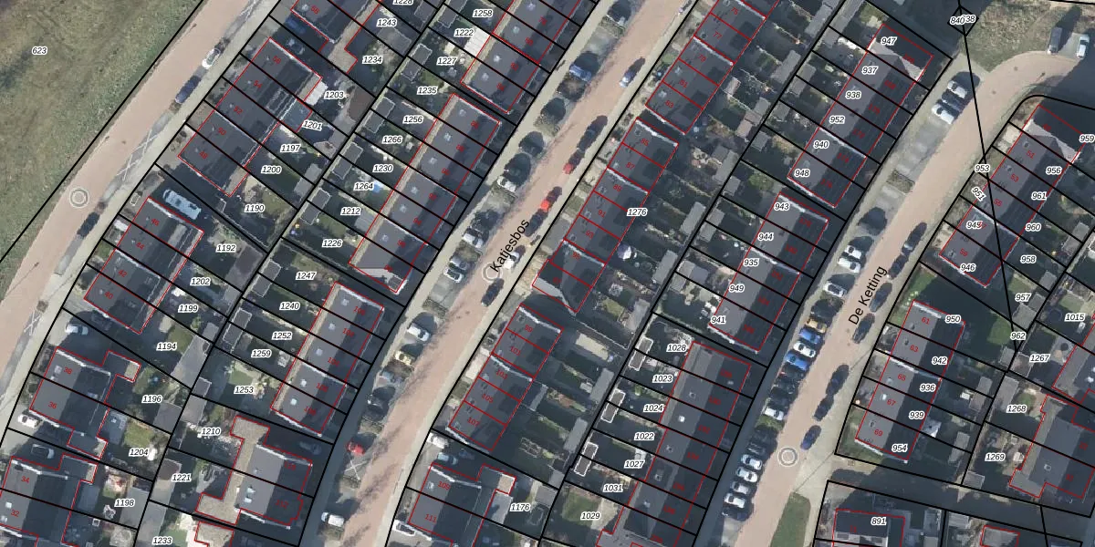 Het perceel waarop Katjesbos 97 staat heeft een oppervlakte van 2525 m². Dit is een zeer groot perceel. De perceeloppervlakte wordt geregistreerd door het Kadaster. Gedetailleerde informatie over de maten van dit perceel kunt u vinden in het rapport Kadastrale kaart met maatvoering van Katjesbos 97.