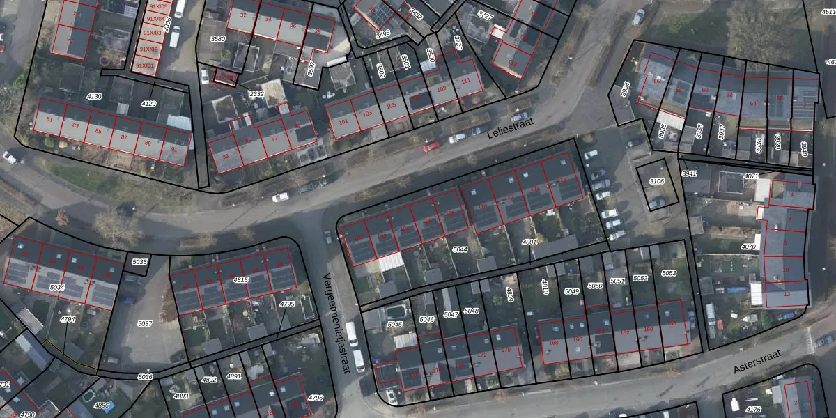 Het perceel waarop Leliestraat 106 staat heeft een oppervlakte van 1436 m². Dit is een zeer groot perceel. De perceeloppervlakte wordt geregistreerd door het Kadaster. Gedetailleerde informatie over de maten van dit perceel kunt u vinden in het rapport Kadastrale kaart met maatvoering van Leliestraat 106.