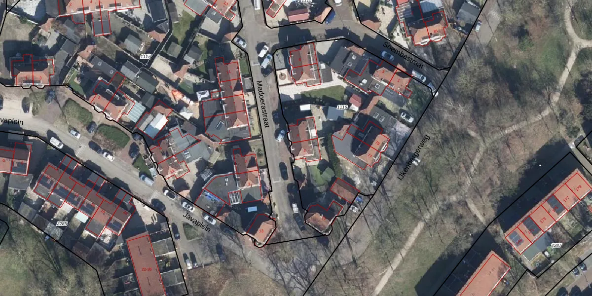 Het perceel waarop Madoerastraat 2 staat heeft een oppervlakte van 2201 m². Dit is een zeer groot perceel. De perceeloppervlakte wordt geregistreerd door het Kadaster. Gedetailleerde informatie over de maten van dit perceel kunt u vinden in het rapport Kadastrale kaart met maatvoering van Madoerastraat 2.